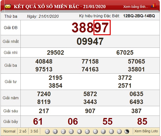 Nhìn vào bảng kết quả xổ số ngày 20/01/202 có kết quả là 50, ngày 21/01/2020 có kết quả là 97. Áp dụng công thức ta có: