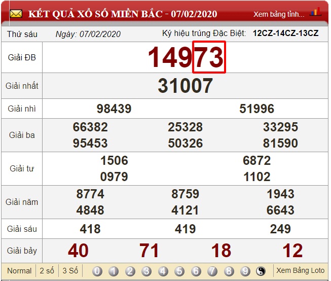 Nhìn vào bảng kết quả xổ số ngày 06/02/2020 có kết quả là 75, ngày 07/02/2020 có kết quả là 73. Áp dụng công thức ta có: